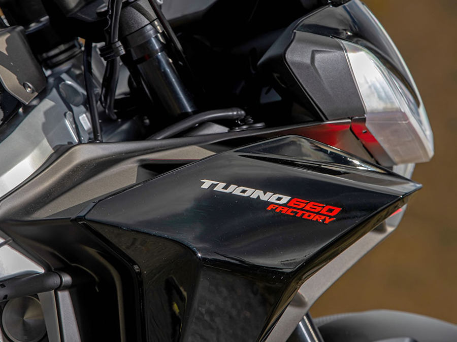 The Tuono 660 Factory APRC includes ATC (Aprilia Traction Control), AWC (Aprilia Wheelie Control) adjustable wheelie control system, ACC (Aprilia Cruise Control) to maintain the set speed without acting on the throttle; AQS (Aprilia Quick Shift), the electronic gearbox, for very quick changes without closing the throttle and without using the clutch, also equipped with a downshift function, which allows you to downshift without touching the clutch; AEB (Aprilia Engine Brake), the adjustable engine brake control system during the gas closing phase; AEM (Aprilia Engine Map), different mappings available to change the character and way of delivering engine power.